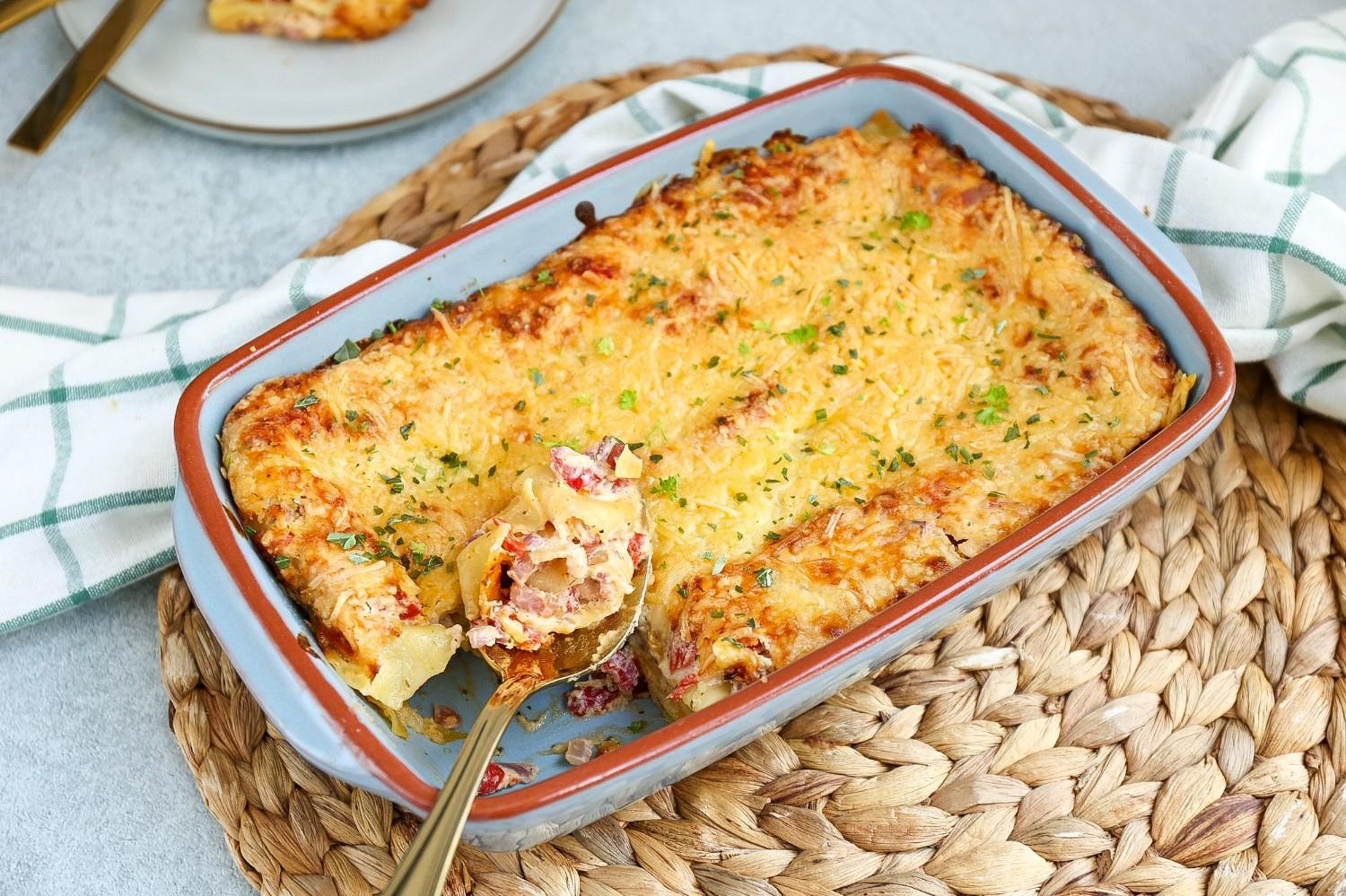 • Strooi wat geraspte kaas over de bovenkant en zet de ovenschotel voor ongeveer 30-35 minuten in de oven. Maak ondertussen een leuke salade, snijd wat stokbrood en maak wat kruidenspread klaar.
