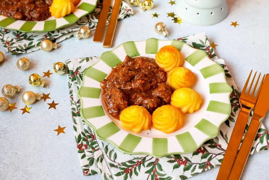 - Snijd het vlees in grove stukken en bestrooi met peper en zout.